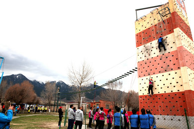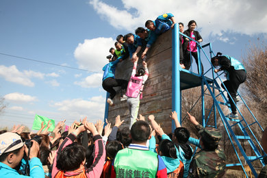 活动在紧张有序的氛围中进行着,各队队员在激烈的角逐里相互协作、齐心协力,彼此鼓励、奋力拼搏,败不馁、胜不骄,焕发出强大的凝聚力和战斗力。首先协同完成了“贪吃蛇”“接力棍”比赛游戏,随后,攻克了在高空中进行的“飞夺泸定桥”“生死相依”“绝壁攀缘”“高空独木桥”等一个又一个难关,特别是在攻取“绝地求生,翻越毕业墙”难关时,全体队员不分单位,齐发力、共奋进,拉开百人“大会战”。随着教练的一声令下,众队员你拉我抬、你拽我扶,在短暂的40分钟内,实现了4米高的“毕业墙”胜利跨越,取得了辉煌战果,令人体味到了严明纪律的重要,同时也感知到集体力量的强大。