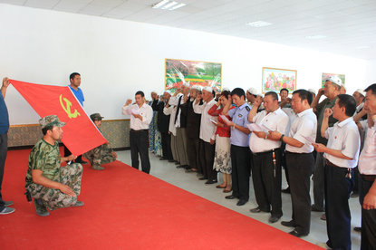 走访结束后,工作组与村党支部在集团资助改建、装饰一新的村民活动中心,李桂江和村党支部书记夏玉苏普·加马力为新党员佩戴了党徽,接着党员们相互佩戴党徽,并集体面对鲜红的党旗重温了入党誓词,工作组和村党支部还对受到乡党委表彰的2名优秀党务工作者和3名优秀党员进行了奖励。