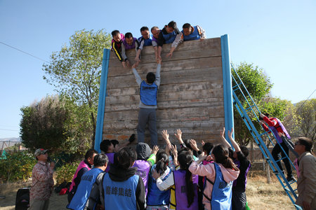 下午,各队攻克了在高空中进行的“生死相依”“绝壁攀缘”“高空独木桥”“缘分天空”“千足蜈蚣”等一个又一个难关。最后,在攻取“绝地求生,翻越毕业墙”难关时,全体队员不分部门,齐发力、共奋进,拉开“大会战”。随着教练的一声令下,众队员你拉我抬、你拽我扶,实现了4米高的“毕业墙”胜利跨越,取得了辉煌战果,令人体味到了严明纪律的重要,同时也感知到集体力量的强大。