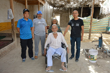 墩克什拉克村85岁高龄的阿吉·苏皮老人近两个月因腿部突发疾患无法站立。渴望外出的他,每天只能坐在大门口看看来来往往的人们。