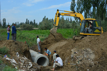 8月12日,墩克什拉克村的排碱沟渠道里一台大型挖掘机正在挖土,修路工人们汗流浃背的忙着安装桥涵,很多村民们围在渠道边,高兴谈论着集团住村工作二组为村民修路的好事。