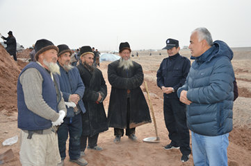一到植树点,正在植树的村民们都围了过来,工作组组长库热西·艾孜孜与村民们一一握手说:“大家辛苦了!植树绿化是功在当代、利在千秋的好事,是在为我们的子孙造福,今天天气很冷,请大家保重好身体。”紧接着,工作组成员就和村民一起推车运土、填坑平地,体验着劳动的辛苦。