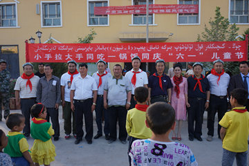 5月31日下午,在“六一”国际儿童节来临之际,集团住坎特艾日克村热闹非凡,到处洋溢着欢乐的气氛。工作组成员与258名学生和家长欢聚一堂,在村广场举办了一场“小手拉大手 同吃一锅饭”庆六一联谊活动。