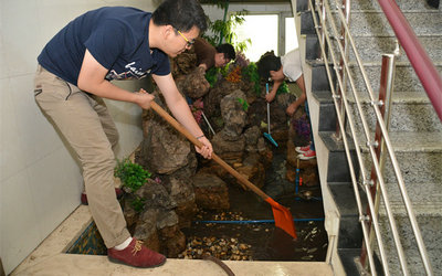 近日,五建机关青年志愿者小分队自告奋勇清理办公楼一楼鱼池。抽水、清污泥、洗刷周边死角....通过3小时的努力,清澈见底的鱼池和欢乐流动的小鱼儿为机关增添了一份夏日的清凉。