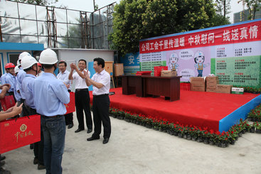 段连吉一路风尘仆仆地走进项目一线进行实地检查,了解项目生产经营整体情况;与员工进行了亲切交谈,详细询问了员工的生产和生活情况,为他们送去了月饼等节日慰问品。在慰问中,段连吉代表集团党、政、工对坚守在外区施工生产一线,克服困难、奋力拼搏的广大员工表示衷心的感谢,对各外区项目当前的工作情况表示肯定,希望广大员工进一步坚定信心、凝聚力量,外树形象、内强管理,扎扎实实地做好每一项工程,树立集团良好品牌形象,取得良好经济效益和社会效益。希望外区分公司和项目部进一步发挥党群组织的作用,加强安全生产管理、加大员工关怀关爱力度,把员工的工作和生活关心好、照顾好。